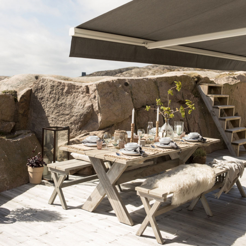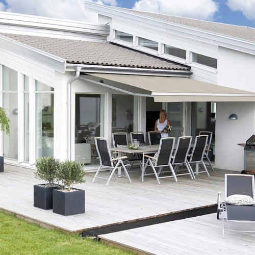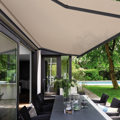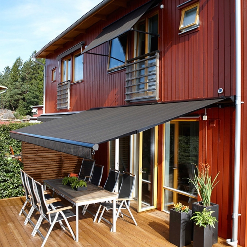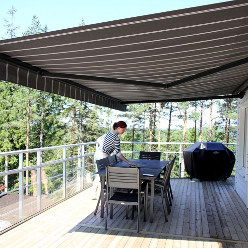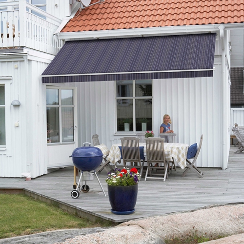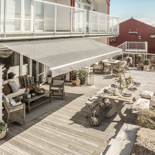 Optimal för dig som vill ha ett extra rum under sommarhalvåret. Den både skyddar dig från sol-, insyn och mot ett stilla sommarregn. Våra terassmarkiser reducerar upp till 70% av solens värmepåverkan vilket ger dig både svalka och skydd mot solens UV-strålar. Vi på AMEX Solskydd kan erbjuda dig flertalet olika modeller av terrassmarkiser. Vårt urval av markisdukar i över 100 kulörer och flertalet tillval gör att du kan få din terassmarkis precis som du önskar.
