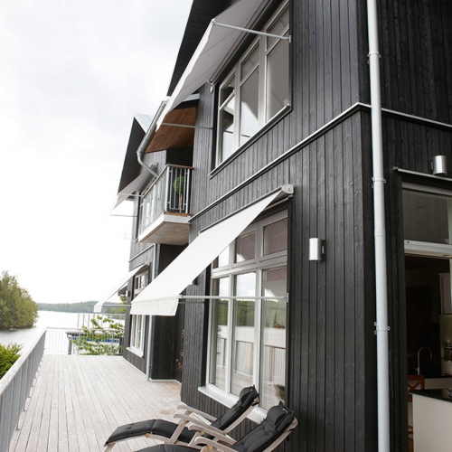 Matcha den mot fasaden eller välj en kulör som bryter och blir en snygg inredningadetalj. För att se prover på kulör och material klicka här så omdirigeras du till vår leverantör. För extra skydd kan du välja att beställa en terrassmarkis som är sluten i kassett. Detta innebär att din markisduk behåller sitt fina skick längre då den inte utsätts för vädrets påfrestningar. Vid större fönsterpartier kan koppling av flera markiser göras med samma kassett vilket är både estetiskt tilltalande och smidigt. Terrassmarkisen monteras antingen mot vägg eller mot tak.
